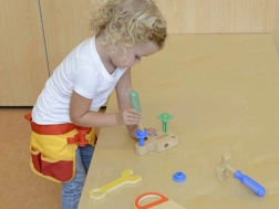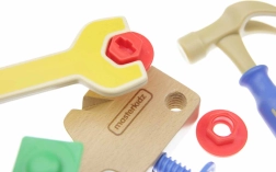 Kalapács, villáskulcs, csavarhúzó, csavarok és tiplik minőségi fából, kellemes fogásúak és ideálisak a finommotorika gyakorlásához.