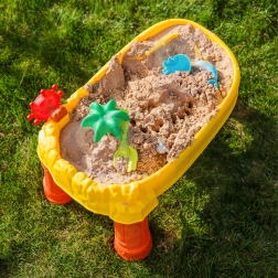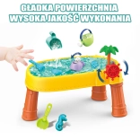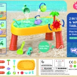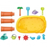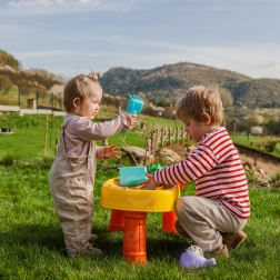 A csomag 8 praktikus kiegészítőt tartalmaz – formákat, halacskát, locsolókannát, füles edénykét, gereblyét és lapátot –, amelyek ösztönzik a kreativitást, a finommotorikát és az együttműködést. Az asztal könnyű, egyszerűen összeszerelhető és tisztítható, így tökéletes a mindennapi játékhoz otthon és a szabadban is.