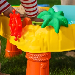 A WOOPIE víz- és homokasztal ideális érzékszervi kísérletezéshez vízzel és homokkal. A stabil szerkezetnek és a színes kiegészítőknek köszönhetően a gyerekek órákig élvezhetik a játékot a kertben, az erkélyen vagy a gyerekszobában. A kalóz kormánykerék történetet ad a játéknak és fejleszti a fantáziát.