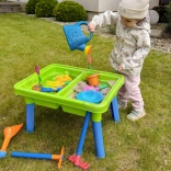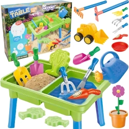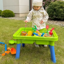 A 13 kiegészítőből álló gazdag felszerelés (locsolókanna, lapátok, gereblye, formák, kis billenőplatós autó, virágcserép virággal és további elemek) ösztönzi a képzelőerőt, fejleszti a finommotorikát, és támogatja az önálló és közös játékot is. Ideális kertbe, teraszra, strandra és gyerekszobába.