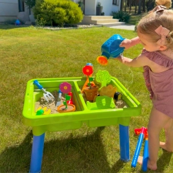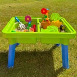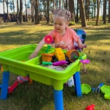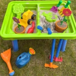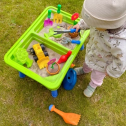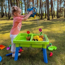 A különálló rekeszek lehetővé teszik a vízi és a homokos tevékenységet egyszerre – a gyerekek önthetnek, átszitálhatnak és formázhatnak anélkül, hogy az anyagok keverednének.