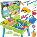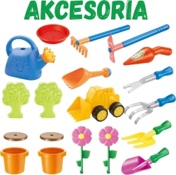 Locsolókanna, lapátok, gereblye, formák, virágcserép virággal és egy kis billenőplatós autó bővítik a játék lehetőségeit és serkentik a gyerekek fantáziáját.