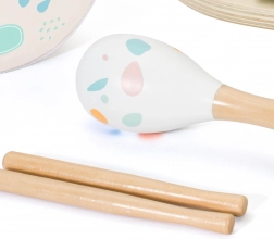 Ez a készlet öt különböző hangszert tartalmaz, melyek tökéletesen illeszkednek a kisgyermekek kezeibe. Minden hangszer kiváló minőségű fából készült és nem mérgező festékekkel van festve, amely biztonságos a gyermekek és a környezet számára.