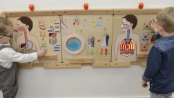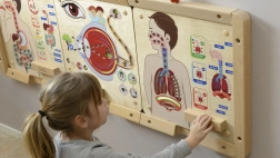 Az interaktív oktatótábla bemutatja a levegő útját a testben, és valósághű illusztrációkat tartalmaz a légzőrendszerről fénydiódás hatásokkal.