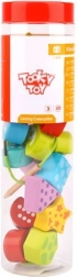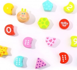 A számozott és különböző alakú elemeket zsinórra lehet fűzni, így a gyerekek természetes módon gyakorolják a számolást, a válogatást és a sorrendet. Ideális az első matematikai lépésekhez.