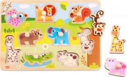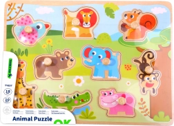 A Tooky Toy márkájú fa puzzle 18 hónapos kortól ajánlott, és tökéletes választás otthonra vagy óvodába. A készlet egy táblából és 9 darab állatos elemből áll, amelyeket a megfelelő helyre kell illeszteni. A táblán mélyedések találhatók, amelyek megfelelnek a színes puzzle-darabok alakjának. Az egész szett fából készült, és biztonságos festékekkel van színezve, ami minden gyermeket megörvendeztet és rengeteg szórakozást biztosít.