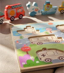 Ez a fa Montessori beillesztő játékos formában kínál szórakoztató tanulást. A készlet egy masszív tábla kivágásokkal és 7 járműelemmel (pl. autó, taxi, rendőrség, mentő, tűzoltó, repülő, hajó) áll, amelyeket a gyerekek alak és kép alapján párosítanak. A világos színeknek és az áttekinthető körvonalaknak köszönhetően a gyerekek gyorsan megértik a párosítás elvét, és minden helyesen behelyezett elemmel sikerélményt szereznek.