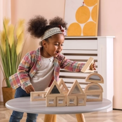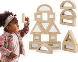 Bővítse a gyerekek fantáziáját minőségi tükrös felületű fa kockákkal. A készlet 16 elemet tartalmaz négy formában – téglalap, négyzet, szabályos háromszög és félkör – amelyek remekül rakhatók és építhetők. A tükröződő hatás természetes módon támogatja az én-tudatot és az érzékszervi észlelést játék közben.