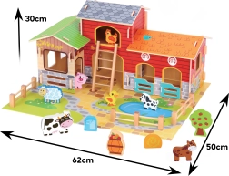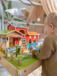 Építsetek saját gazdaságot otthon! A WOOPIE GREEN fából készült mega farm bevezeti a gyerekeket a természet világába, ahol megtanulnak gondoskodni az állatokról és felfedezhetik a vidéki mindennapokat. A valósághű épületek (istálló, pajta és tyúkól), a tó és a részletgazdag figurák támogatják a kreatív történetmesélést és a szerepjátékot.