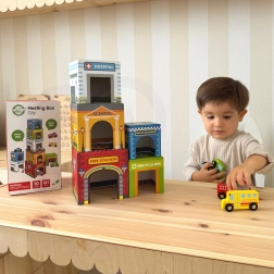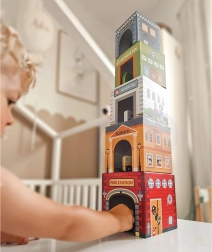 A WOOPIE GREEN beillesztős város kreatív alternatívát kínál a klasszikus építőjátékokhoz. Az öt illusztrált kartonkocka ismert városi épületeket jelenít meg (pl. tűzoltóság, iskola, kórház, rendőrség), és 1-től 5-ig számozott a számolás és a méretek játékos tanulásához. A kockákon található speciális nyílások lehetővé teszik a járművek beillesztését és tárolását, így a gyerekek saját történeteket és városi jeleneteket alkothatnak.