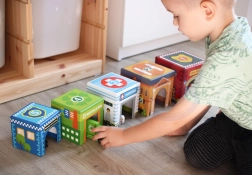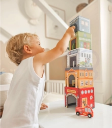 Öt számozott kocka nyílásokkal lehetővé teszi tornyok építését, a járművek belülre helyezését és a város játékos felfedezését – tökéletes a fantázia fejlesztéséhez.