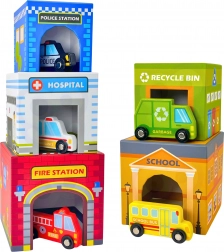A készlet öt aranyos fa kisautót tartalmaz csendes, gumis kerekekkel (pl. tűzoltóautó, mentő, rendőrautó, autóbusz, kukásautó). A játék fejleszti a kreativitást és a képzelőerőt, a vizuális észlelést és a kéz–szem koordinációt. Az anyagok és festékek biztonságosak és nem mérgezőek, ideális választás 12 hónapos kortól kis felfedezőknek.