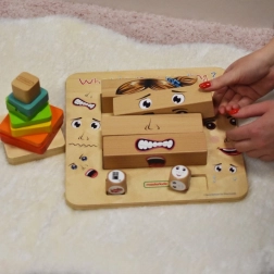 Négy fa blokk segítségével a gyerekek akár 64 különféle mimikát rakhatnak ki, amelyek szemléltetik az örömöt, szomorúságot, félelmet és dühöt, és megtanítják, hogyan változtatja meg az arc kifejezése az érzelmek jelentését.