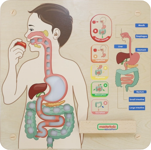 Fedezd fel, hogyan működik az emberi test a Masterkidz oktatótáblával. A gyerekek megértik, hogyan dolgozza fel az ételt az emésztőrendszer, megismerik a fő szerveket és az emésztés egyes fázisait a fényes elemeknek köszönhetően. A tábla fejleszti a finommotorikát, a érzékelést, a kéz–szem koordinációt és a kíváncsiságot, használható falon, asztalon vagy a padlón.
