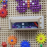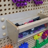 A tároló tartalma első pillantásra látható – a gyerekek könnyen megtalálják a megfelelő tüskéket és csavarokat, így a munka a STEM táblán folyamatos és szórakoztató.