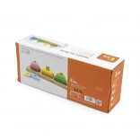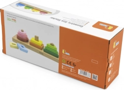 Minden elem minőségi fából készül, lekerekített élekkel, és biztonságos, nem mérgező festékekkel lakkozva. A játékot úgy tervezték, hogy bírja a mindennapos használatot, és vizuálisan is ösztönző legyen – ideális a színek, formák és az első számok tanulásához.