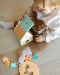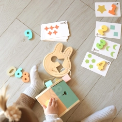 - Minden egyben: formaválogató, számok kártyákkal, kockák és fűzős nyuszi.