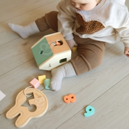 Ez az elegáns, pasztell szett úgy lett tervezve, hogy egyszerre szórakoztasson és fejlesszen. A forma válogatás, a számolás és a fűzés kombinációjával a gyerekek gyakorolják a fogást, a türelmet és a koncentrációt, miközben természetes módon sajátítják el a színeket, formákat és az első számokat. A fa elemek kellemes tapintásúak, simák és biztonságos élűek.