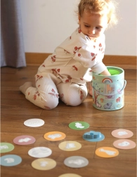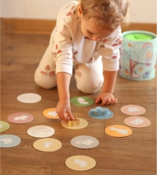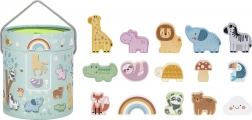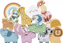 Tartalmaz 15 fafigurát, amelyek közé állatkák, szivárvány, felhőcske és gomba tartoznak a változatos és oktató játék érdekében.