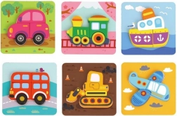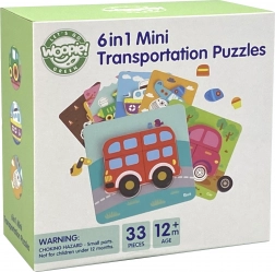 Woopie fa puzzle járművek egy 33 elemből álló készlet, amely 6 tartós, színes kártyát tartalmaz. A gyerekek feladata, hogy a nagy, fából készült elemeket illesszék össze a színes kirakó elkészítéséhez.
