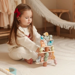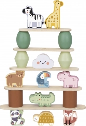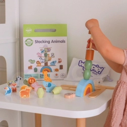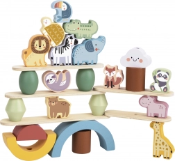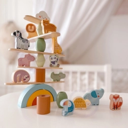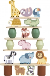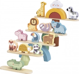 Fa állatok rakáshoz ideális játék a gyermekkreativitás fejlesztésére. A készlet tartalmaz 12 aranyos fa állatot és 16 egyensúlyozó elemet, mint például fa szivárvány, kövek, platformok és vidám felhő.