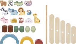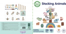 A készlet 29 darabot tartalmaz, beleértve a fa állatokat és az egyensúlyozó elemeket, így lehetőséget ad egyedi építmények létrehozására.