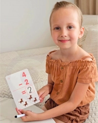 A készletet úgy tervezték, hogy a gyermek ismételten gyakorolhassa a számolást a mellékelt törölhető marker segítségével. A kártyák kivonásra és összeadásra vannak osztva. A tanulás megkönnyítése érdekében a kártyák két szintet tartalmaznak - kezdhetnek azzal az oldallal, ahol a matematikai feladatokat képek egészítik ki, amelyek segíthetnek a gyermeknek a számítási eredményben. A kártyák másik oldala képi segítség nélküli számításokat kínál. Ennek a tanulási modellnek köszönhetően a gyermek nem érzi az új anyag nehézségének nyomását, és a matematikai példák megoldása tiszta öröm lesz! Gyermeke tanulási motivációjához minden helyesen megoldott példához egy szívet lehet rajzolni a kártya sarkába.