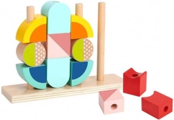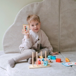 A sima, pasztell színű fa elemek kellemes tapintásúak és biztonságosak a kis kezek számára. Ideális 2 éves kortól.