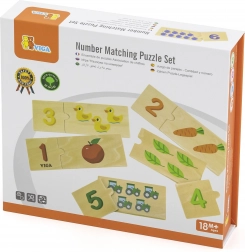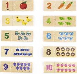 Ez a csodálatos fából készült puzzle készlet a VIGA-tól a számolási és számfelismerési gyakorlatra összpontosít. A gyermekek könnyen tanulhatnak számolni, számokat felismerni és a helyes mennyiséget társítani minden számhoz ezeknek a puzzle-öknek a segítségével. Az állatok, gyümölcsök vagy járművek vonzó színei és képei révén a gyermekek felfedezhetik a körülöttük lévő világot. Továbbá fejlesztheti a koncentrációt, szókincset és logikus gondolkodást.