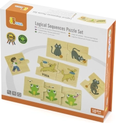 A VIGA márka szórakoztató és fejlesztő fa puzzle készlete megtanítja a gyerekeknek, hogyan rendezzék az állatok tevékenységeit a helyes sorrendbe. 24 fa elemet tartalmaz, amelyekből 8 logikai sorozat áll össze (pl. kutya apportírozása vagy zsiráf, amely leveleket tép a fáról). Támogatja a logikus gondolkodást, a szókincset, a koncentrációt, a finommotorikát és a vizuális koordinációt, és már 18 hónapos kortól ajánlott.