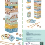 WOOPRIE márkájú Rezgő torony játék nagyszerű választás gyermekei motorikus fejlődéséhez és szórakozásához!  A készlet 82 darab tartós fából készült elemet tartalmaz, pasztellszínekkel és állatos matricákkal. Remekül fejleszti a stratégiai gondolkodást és a koncentrációt.