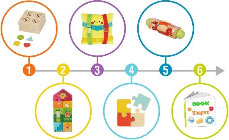 Formaválogató (16 elem/4 forma), párna csatokkal, rakosgató torony (5 szint, 15 elem), forgatható állatos kirakó, kétoldalas puzzle, formákról szóló füzet