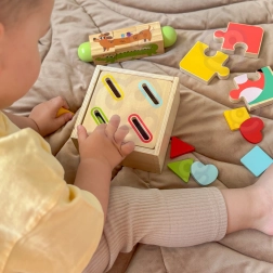 Biztonságos fa és textil kivitel, telt színek és kompakt csomagolás füllel – így praktikus ajándék a mindennapokra. A gyerekek játszanak, válogatnak, építenek és felfedeznek – miközben természetesen fejlesztik a további tanuláshoz szükséges készségeket.