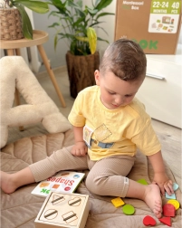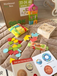 Komplex montessori készlet 22–24 hónapos gyermekeknek, akár 7 az 1-ben: fa formaválogató, aktivitás párna csatokkal, rakosgató torony, forgatható állatos kirakó, kétoldalas puzzle és egy formákról szóló füzet + szülői útmutató. Támogatja a finommotorikát, a kéz–szem koordinációt, a logikus gondolkodást és a színek, formák felismerését.