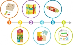Formaválogató (16 elem/4 forma), párna csatokkal, rakosgató torony (5 szint, 15 elem), forgatható állatos kirakó, kétoldalas puzzle, formákról szóló füzet