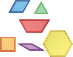 Ismerkedjetek a hatszögekkel, négyzetekkel, trapézokkal, háromszögekkel, rombuszokkal és paralelogrammákkal kék, piros, zöld, sárga, lila és narancssárga színben. Ideális válogatáshoz, kirakáshoz és szemléletes geometriához.