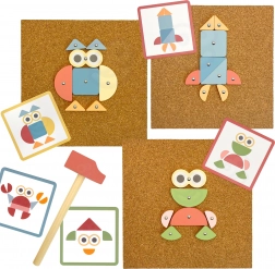 Komplett készlet fa formákkal, szögekkel, kalapáccsal és parafatáblával. A gyerekek követhetik a mintakártyákat, vagy szabadon alkothatnak.