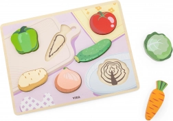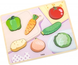 A VIGA fa beillesztő játék 7 darabbal, népszerű zöldségformákkal (paprika, paradicsom, répa, uborka, burgonya, káposzta és hagyma) ideális ötvözete a tanulásnak és a játéknak. A gyerekek gyakorolják a formák és színek felismerését, fejlesztik a párosítást, és játékos módon erősítik a memóriát és a koncentrációt.
