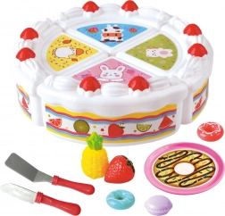 A készletben szeletelhető gyümölcsdarabok és makaronok/sütik is vannak, amelyek bővítik a cukrászdás és teadélutános szerepjáték lehetőségeit.