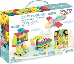 A WOOPIE építőkészlet 86 részből áll, amelyek könnyen összefűzhetők és lehetővé teszik a gyerekek számára különböző 3D konstrukciók építését, mint például autók, repülők vagy állatok. A kockák nagyok és puhák, ami biztosítja a játék biztonságát, és 120 fokon kifőzhetőek a könnyű karbantartás érdekében.