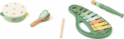A készlet xilofont, tamburint, furulyát/rekordert, kasztanyettát és ütőpálcát tartalmaz – ideális kombináció a ritmusok és hangok felfedezéséhez már 18 hónapos kortól.