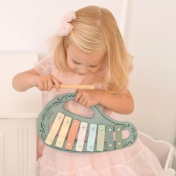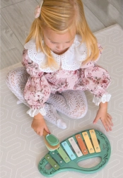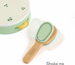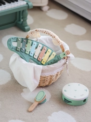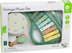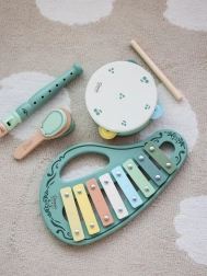Ez a stílusos, vintage kivitelű készlet mindent tartalmaz, amire a kicsiknek szükségük van a hangok világának felfedezéséhez: cimbalom (xilofon), tamburin, furulya/rekorder, kasztanyetta és ütőpálca. A fa és fém kombinációjának köszönhetően a hangszerek kellemes hangzásúak és bírják a mindennapos használatot.