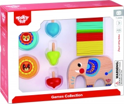 Ez a színes, 46 darabos fa készlet több közkedvelt játékot egyesít egy csomagban. A gyerekek kiegyensúlyozhatják a pálcikákat az elefánt hátán, építhetnek tornyot vagy „kutat”, játszhatnak mikádót, trükköket gyakorolhatnak a két jojóval, és versenyezhetnek, kinek a pörgettyűje forog tovább. Ideális önálló játékhoz és családi vetélkedéshez is.