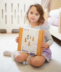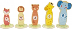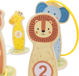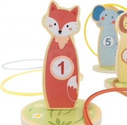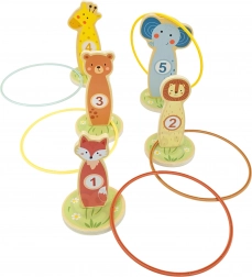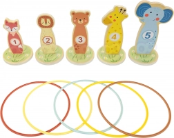 Ez a fa karikadobó játék kedves állatokkal (róka, medve, oroszlán, zsiráf és elefánt) megtanítja a gyerekeket célba dobni, fejleszti a finommotorikát és a koncentrációt. Minden céltáblán szám szerepel – a gyerek így természetes módon tanul meg pontokat számolni és megtervezni a következő dobásokat. Az elemek tetszés szerint elhelyezhetők, így könnyű változtatni a nehézségen.