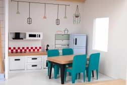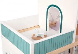 Fedezze fel a modern építészet báját a gyerekek világában. A TOOKY TOY fa babaház 3 részletgazdag szinttel rendelkezik – a földszinten konyha étkezővel és fürdőszoba, az első emeleten tágas nappali, a tetőtérben pedig hangulatos hálószoba erkéllyel. A készletben bútorok és dekorációk is találhatók, amelyek minden helyiségnek élethű hangulatot adnak.