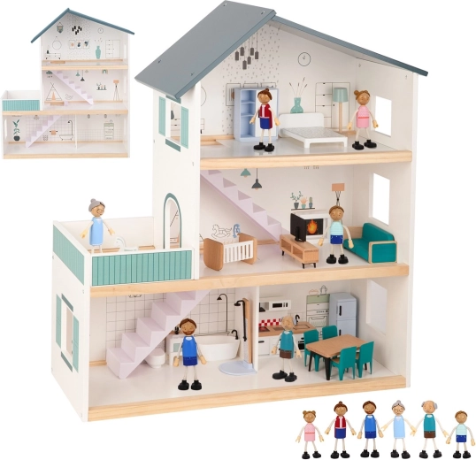 A stílusos TOOKY TOY fa babaház három szinttel és rengeteg részlettel rendelkezik, többek között konyhával, nappalival, fürdőszobával és erkéllyel ellátott hálószobával. A készlet része a bútorzat és egy 6 tagú mozgatható figuracsalád, melyek támogatják a kreatív és szociális játékot. A masszív fából készült szerkezet és a biztonságos kivitelezés finom színekkel 3 éves kortól ideális.