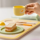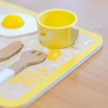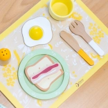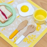 A szett tartalmaz tányért, evőeszközöket, bögrét, sót, borsot, tojást, pirítósokat, egy szelet szalonnát és még sok mást.