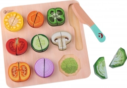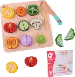 Ez a készlet tökéletes kiegészítője a szerepjátékoknak már zsenge kortól kezdve, nemcsak szórakozást nyújt, hanem oktatási értékkel is bír. Tartalmaz 20 különféle elemet, beleértve a kétoldalas deszkát, kést és zöldségeket. A játék 18 hónapos kortól ajánlott, és lakkozott fából készült, nem mérgező festékekkel van festve, ami garantálja a teljes biztonságot.