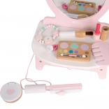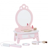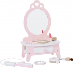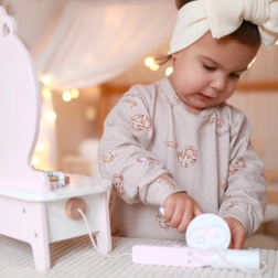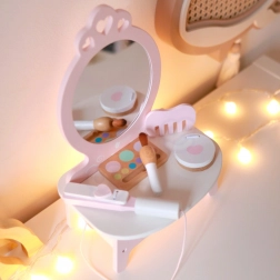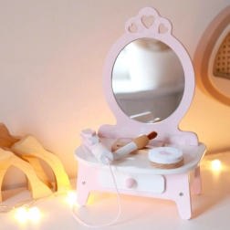 Ez a gyönyörű rózsaszín gyerek pipereasztal tükörrel és 11 különböző kiegészítővel rendelkezik, amelyek közé tartozik a fésű, a rúzs, a hajvasaló, a púderdoboz és még sok más. Minden kiegészítő kiváló minőségű fából készült, és pasztell színű designjuk varázslatos megjelenést kölcsönöz a játéknak. Az asztal elegendő tárolóhelyet kínál a kis modell összes titkos kozmetikai trükkje számára.