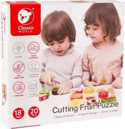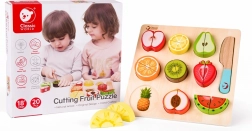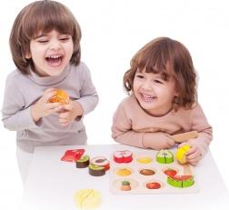 A készlet 20 darabot tartalmaz, beleértve a kétoldalú deszkát, kést és különféle gyümölcsöket. Ez a biztonságos játék 18 hónapos kortól készült lakkozott fából és nem mérgező festékekkel festve, biztosítva, hogy teljesen biztonságos a használata.